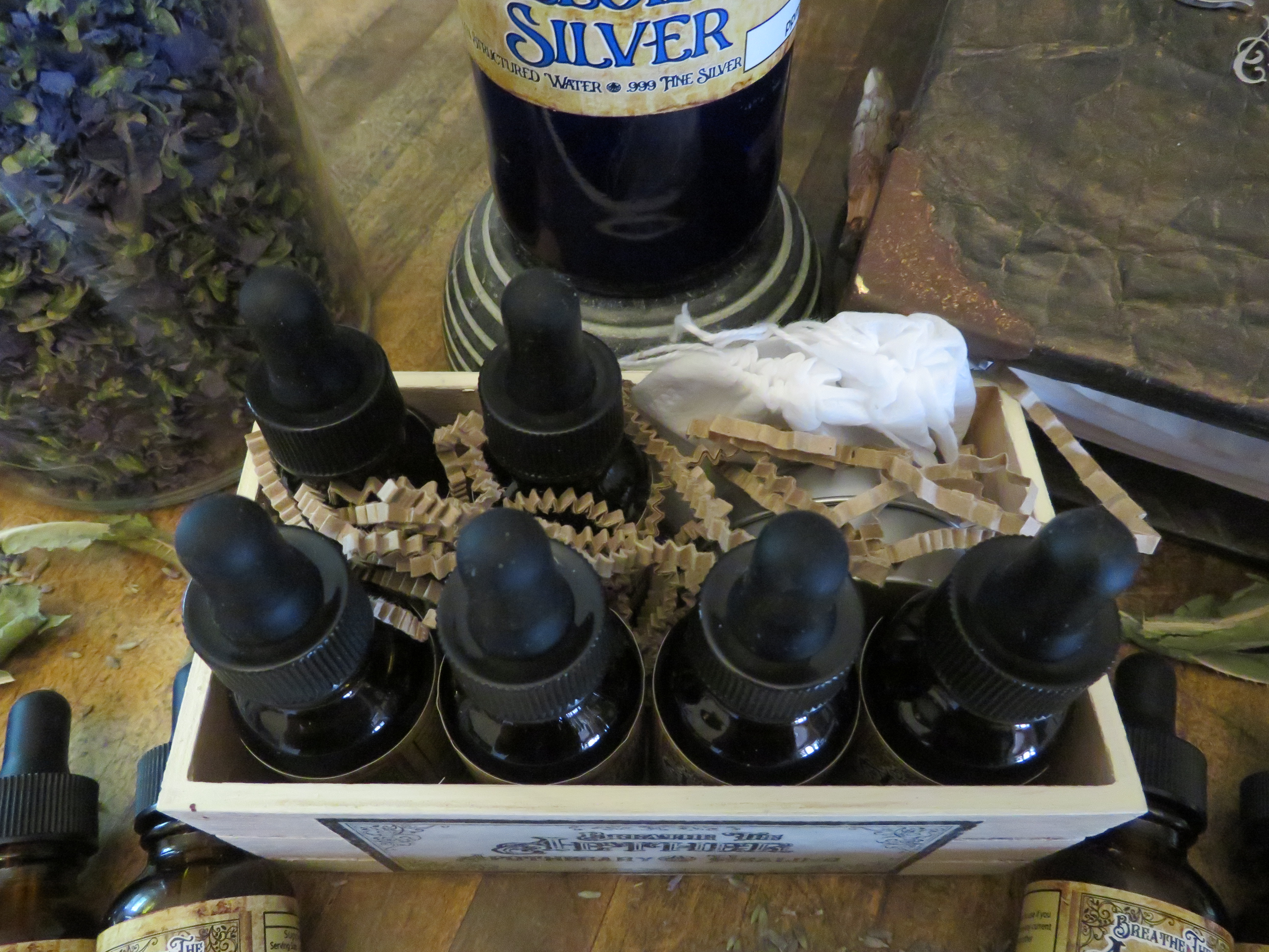 You Get: (6) Different 1oz Bottles , (6) different Tinctures, (1) 1oz Tin of Pain-Ease Salve, (1) 12oz Blue Bottle of Pure Colloidal Silver, (2) samples of our Teas in Bags, and all in a small hand painted little crate to keep all of them organized on your counter or shelf or cabinet.